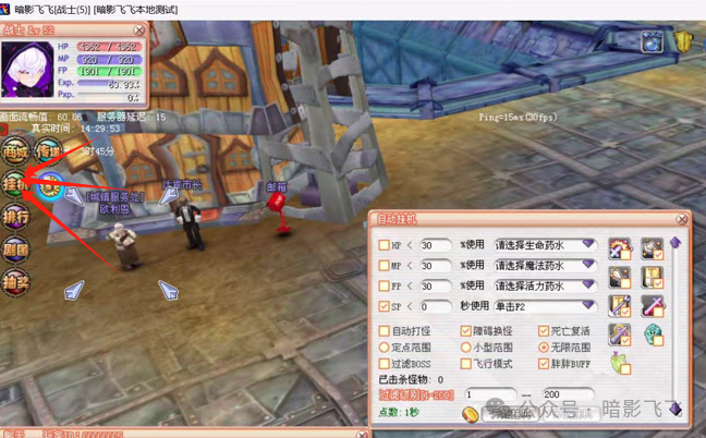 2,新手扶持计划升级到一定等级可以领取对应的奖励,奖励将自动发到背包里2级:时装(7天)、捡宠(7天)、挂机币(24个)、超级HP、MP、FP(8个)、5级套装(7天)10级:15级各职业完美武器(7天)20级:黄金滑板(3天)30级:眼镜黑色(永久),力量之石(5个),ES増爆卷(5个)3、内挂系统